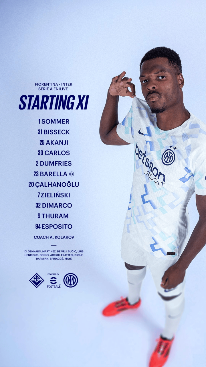 海外米兰首发:1-索默、31-比塞克、25-阿坎吉、30-卡洛斯-奥古斯托、2-邓弗里斯、23-巴雷拉、20-恰尔汗奥卢、7-泽林斯基、32-迪马尔科、9-马库斯-图拉姆、94-皮奥-埃斯波西托