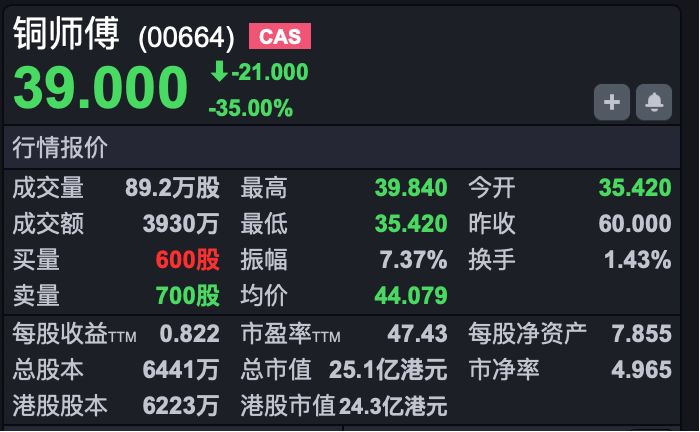 其中,铜师父(HK00664)低开40%,随后股价有所回升。抑遏发稿,依旧跌超35%。