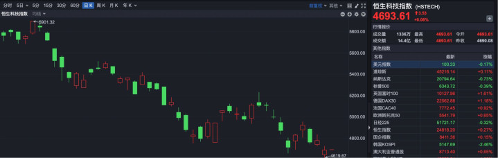 恒生科技指数开盘报4693.61点,高潮3.53点,涨幅0.08%。