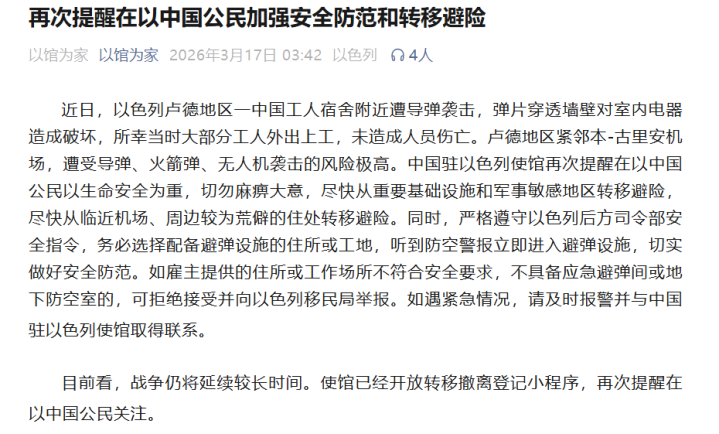 3月17日,据“以馆为家”公众号,中国驻以色列大使馆再次教导在以中国公民加强安全珍贵和休养避险。