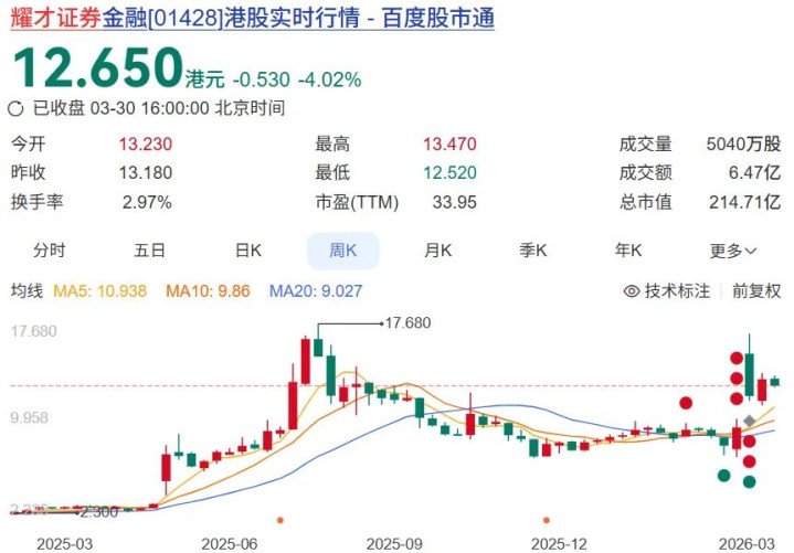 2025年4月,蚂蚁获取控股权时,耀才的全体估值约55.66亿港元。至本年3月30日收盘,其市值已达214亿港元,且刚进入港股通。