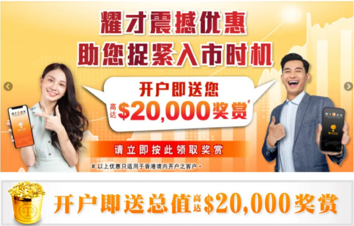 门内的电视大屏握续播放着财经新闻,门口的宣传栏里,贴着开户告白:“来耀才开户即送你20000港币。”
