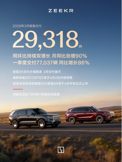 没念念到极氪3月的请托29318辆,同比涨90%、环比涨23%